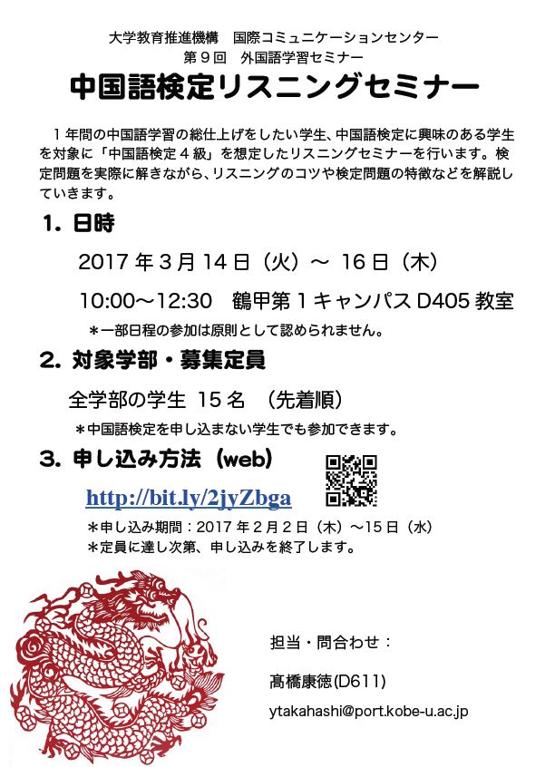 1 年間の中国語学習の総仕上げをしたい学生、中国語検定に興味のある学生を対象に「中国語検定4 級」を想定したリスニングセミナーを行います。